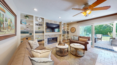 · Custom built–in book cases surrounding the den fireplace.