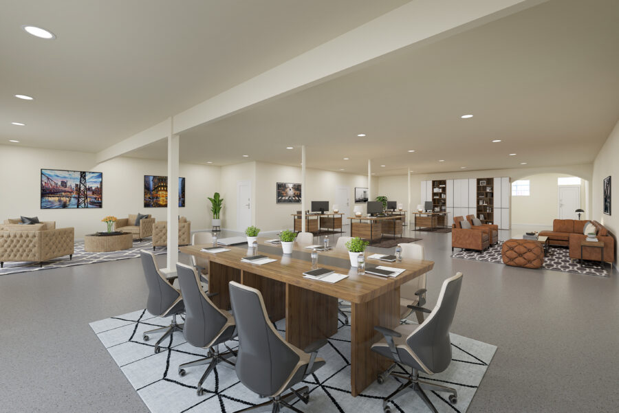 Upon entry through the front lobby, you are welcomed into a spacious open room that occupies most of the ground floor. The layout includes small offices and storage rooms located at the back and side of the building. A staircase at the rear leads to second-story offices, which present the potential for conversion into living space. The first level has a drop ceiling, with an additional 5 feet of height above it, resulting in a total ceiling height of approximately 13 feet. Additionally, a billboard on-site provides a source of supplementary income.