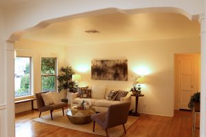 Entering the home from the covered front porch you are welcomed into a spacious bay-windowed living room with custom wood moldings and hardwood floors. A classic Art Deco arch leads to the open dining room with a full-sized picture window facing the front yard greenery and majestic Verdugo Mountains that surround this lovely community.